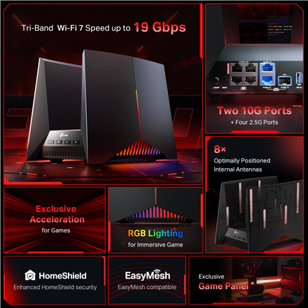 | Summary | TP-Link Archer BE19000 Tri-Band Wi-Fi 7 Gaming Router. WAN connection type: RJ-45. Wi-Fi band: Tri-band (2.4 GHz / 5 GHz / 6 GHz), Top Wi-Fi standard: Wi-Fi 7 (802.11be), WLAN data transfer rate (max): 11520 Mbit/s. Ethernet LAN interface type: 10 Gigabit Ethernet, Ethernet LAN data rates: 10,100,1000,1200,10000 Mbit/s, Networking standards: IEEE 802.11a, IEEE 802.11ac, IEEE 802.11ax, IEEE 802.11be, IEEE 802.11n, IEEE 802.1x. Fiber optic connector: SFP+. Security algorithms: WPA, WPA-Enterprise, WPA2, WPA2-Enterprise, WPA3, Firewall security: SPI Firewall |