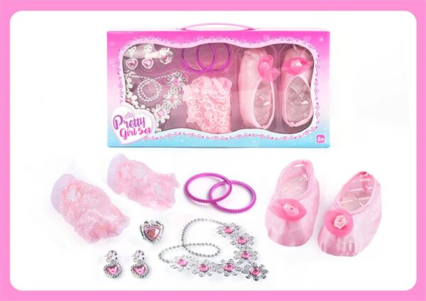 Prekės ženklas- -. Artikulas- MX0393934. Spalva- Sidabro, Rožinė. Medžiaga- Plastikas, Guma. Komplekte- Žaislinės kurpaitės, auskarai, žiedas, pirštinaitės, vėrinys. Rekomenduojamas amžius nuo- 3 m.. Įspėjimas!- Netinka vaikams iki 3 metų. Yra smulkių detalių. Pavojus užspringti..