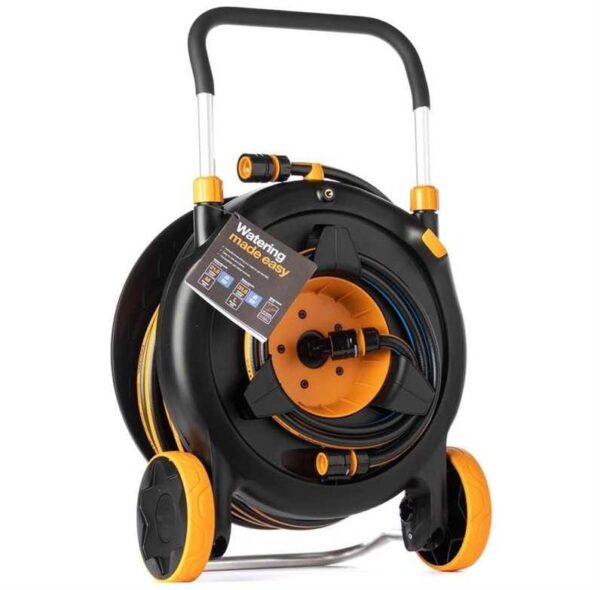 Horizontali padėtis ir 360° pasukimas leidžia pasiekti visus vejos kraštus ir padidinti laistymo plotą. Patogus žarnos vežimėlis leidžia lengvai judėti, o išvynioti ir išvynioti žarną be vargo. Kartu su elegantiška išvaizda gausite kompaktišką, visą komplektą, būtiną sode.