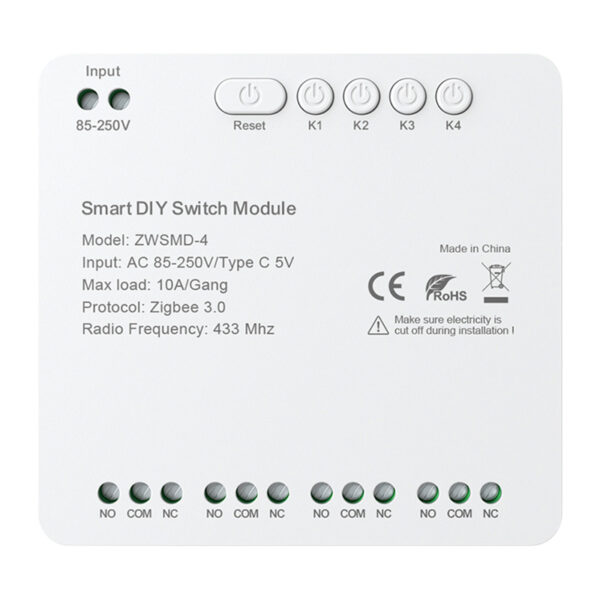 Avatto ZWSMMD-4-250V is a 4-channel ZigBee switch module with voltage-free contact, designed to safely and precisely manage devices up to DC 250V. Each channel supports a load of up to 10 A, which gives great flexibility in controlling lighting, home automation or control systems. The use of a voltage-free contact makes the module ideal where separation of the power circuit from the control signal is required.