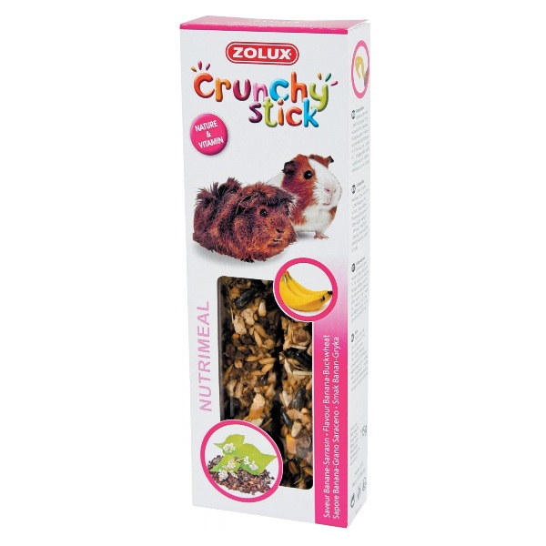 Pagaminti iš natūralių ingredientų, pilnų vitaminų, Crunchy Sticks buvo specialiai sukurti kaip papildomas maistas jūros kiaulytėms. Sukurti pagal receptus, atitinkančius specifinius kiekvienos rūšies poreikius, jie taip pat buvo praturtinti 2 ingredientais jūsų malonumui: bananais ir grikiais. Sveiki, be dažiklių, konservantų ir pridėtinio cukraus, jie palaiko natūralų dantų augimo reguliavimą. Jie parduodami modernioje ir patrauklioje pakuotėje, papildomai supakuoti į maišelį, kuris ilgiau išlaiko šviežumą, kuris ne tik išlaiko jų kokybę, bet ir apsaugo nuo vabzdžių. Kiekvienoje pakuotėje yra dvi kolbos su plastikiniu kabliuku, kurios dėka jas lengva pakabinti narve. Pakuotėje 2vnt skanėstų. Gamintojas: Zolux, Lenkija