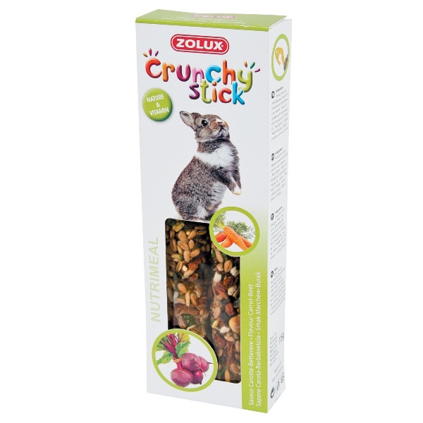 Pagaminti iš natūralių ingredientų, pilnų vitaminų, Crunchy Sticks buvo specialiai sukurti kaip papildomas maistas triušiams. Sukurti pagal receptus, atitinkančius specifinius kiekvienos rūšies poreikius, jie taip pat buvo praturtinti 2 ingredientais jūsų malonumui: morkomis ir burokais. Sveiki, be dažiklių, konservantų ir pridėtinio cukraus, jie palaiko natūralų dantų augimo reguliavimą. Jie parduodami modernioje ir patrauklioje pakuotėje, papildomai supakuoti į maišelį, kuris ilgiau išlaiko šviežumą, kuris ne tik išlaiko jų kokybę, bet ir apsaugo nuo vabzdžių. Kiekvienoje pakuotėje yra dvi kolbos su plastikiniu kabliuku, kurios dėka jas lengva pakabinti narve. Pakuotėje 2vnt skanėstų. Gamintojas: Zolux, Lenkija