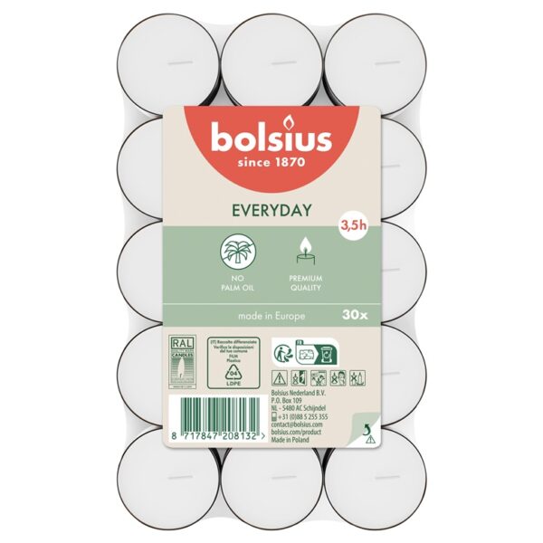 Prekės ženklas- Bolsius. Artikulas- 103630294400. Aukštis- 1.5 cm. Skersmuo- 3.8 cm. Spalva- Balta. Žvakės tipas- Arbatinė. Kvapas- Bekvapė. Degimo laikas- 3.5 – 3.5h. Vienetai pakuotėje- 30. Privaloma garantija- 24 mėn.