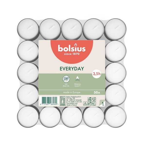 Žvakė, arbatinė Bolsius, 3.5 h, 50 vnt., Balta